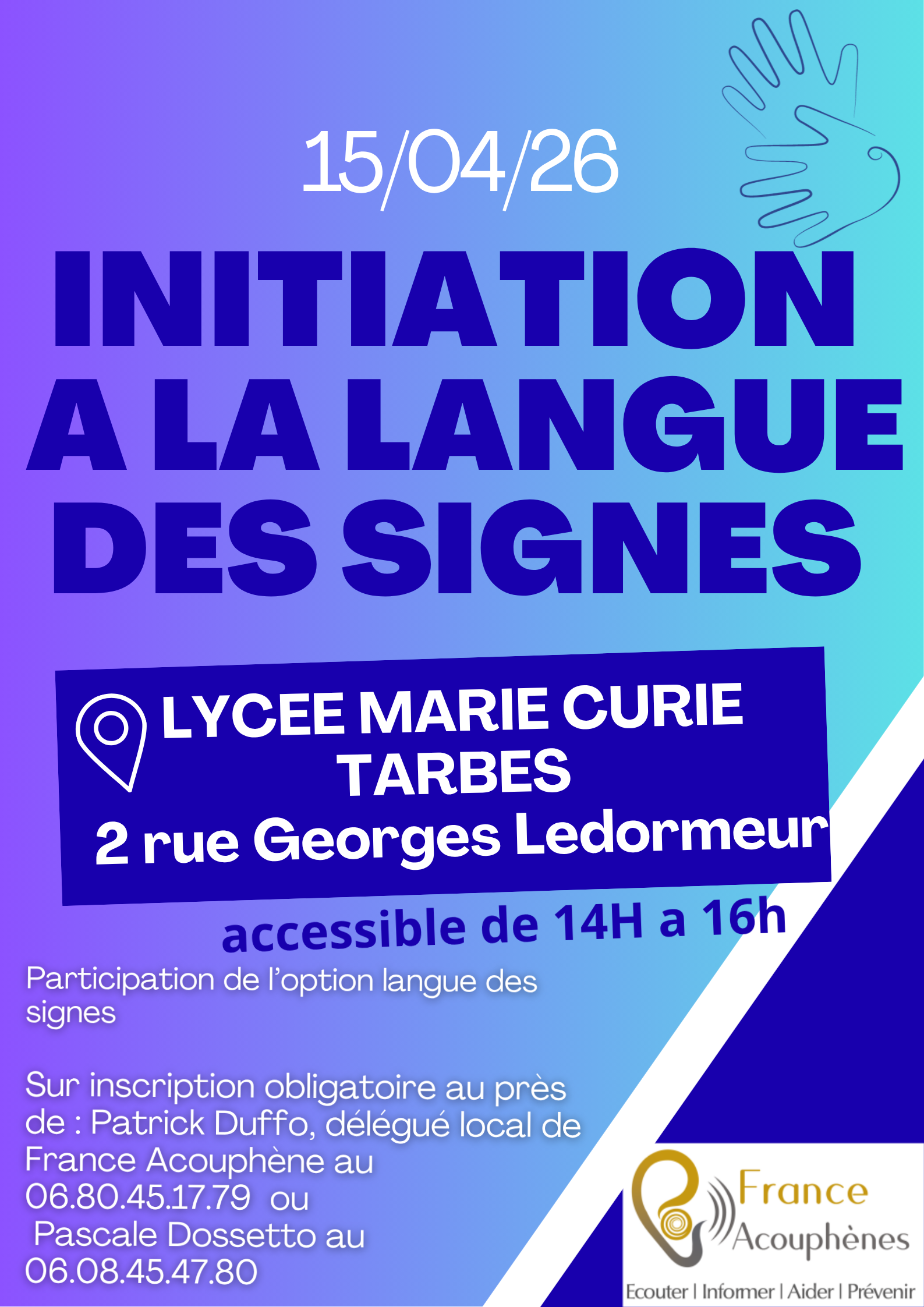 Les élèves de terminale LSF seront ravis de vous accueillir pour vous initier à la langue des signes ! Ouvert à tous de 14h à 16h! Sur inscription. Venez nombreux !!